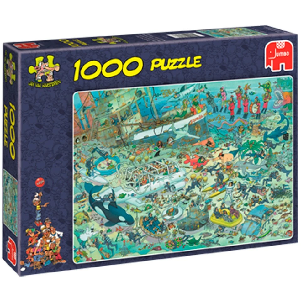 Jan van Haasteren tekent al tientallen jaren exclusief voor Jumbo, humoristische kleurrijke platen met veel detail. De doorgewinterde fan zoekt in elke legpuzzel direct naar de haaienvin, het handelsmerk van Jan van Haasteren. Maar er zijn meer kenmerken; Sinterklaas, de handjes, het kunstgebit en Jan’s zelfportret kom je ook bijna altijd tegen.