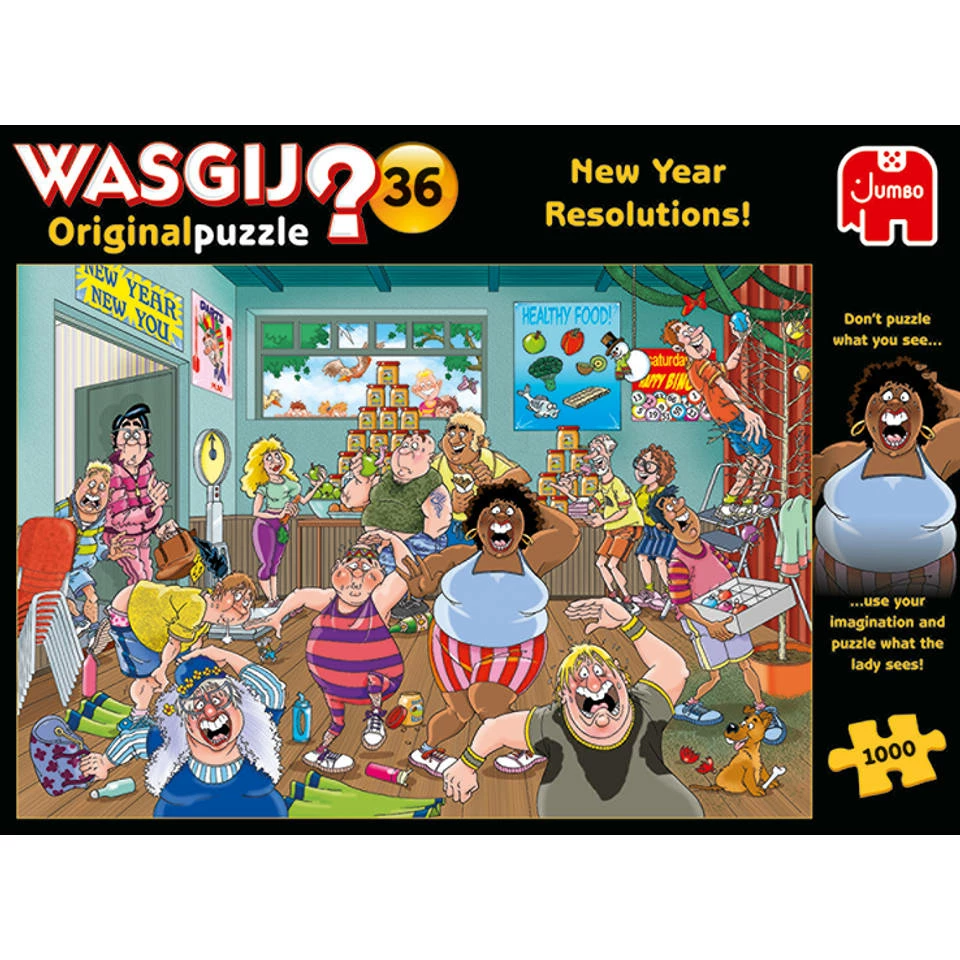 Deze Jumbo Wasgij Original 36 puzzel met als thema goede voornemens is een kleurrijke puzzel van 1000 stukjes.