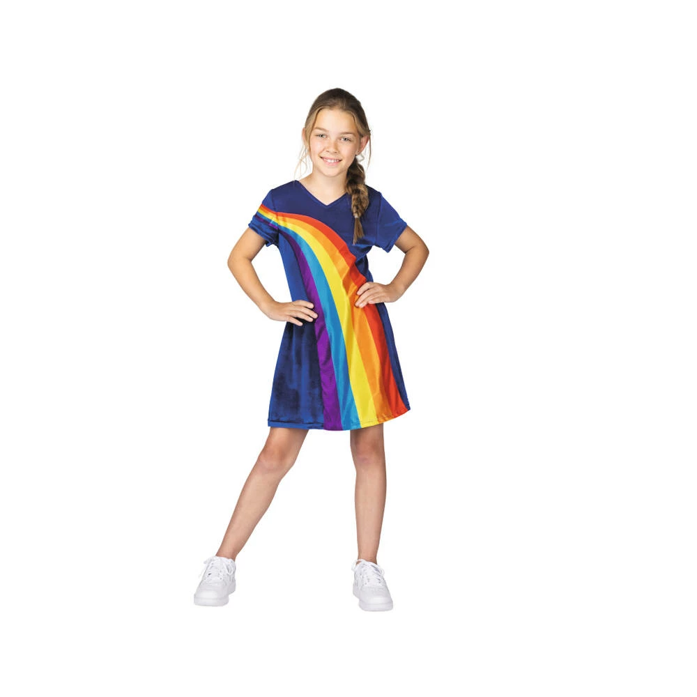 Dans en zing net als de meiden van K3 in dit mooie verkleedjurkje. De jurk is blauw met een kleurige regenboog erop. Zet je favoriete K3-liedje op en dansen maar! Het jurkje is uitgevoerd in maat 116.