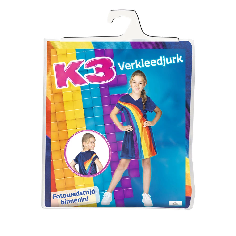 Je wordt de ster van de dag met dit mooie K3 verkleedjurkje. Trek de jurk aan, zing je favoriete K3-liedjes en oefen de danspasjes. De jurk is uitgevoerd in maat 152 en is makkelijk aan en uit te trekken.