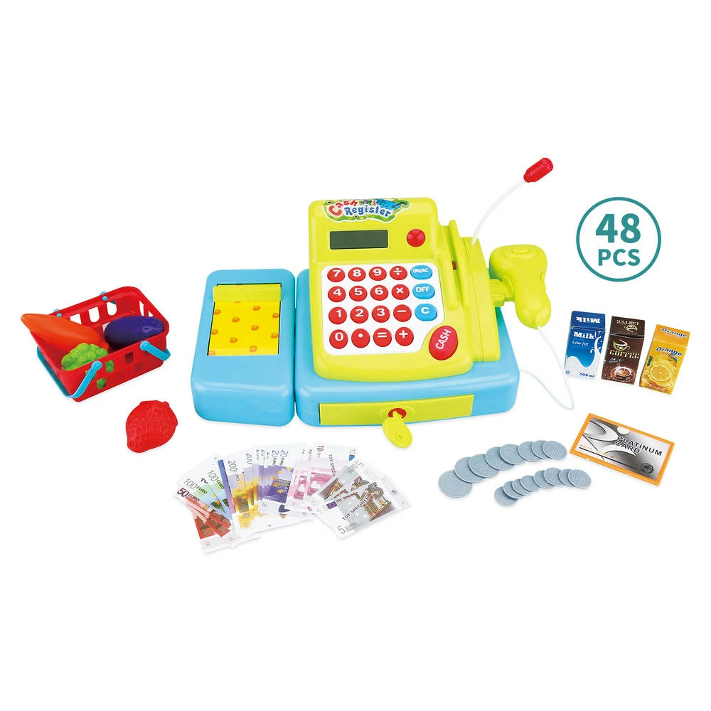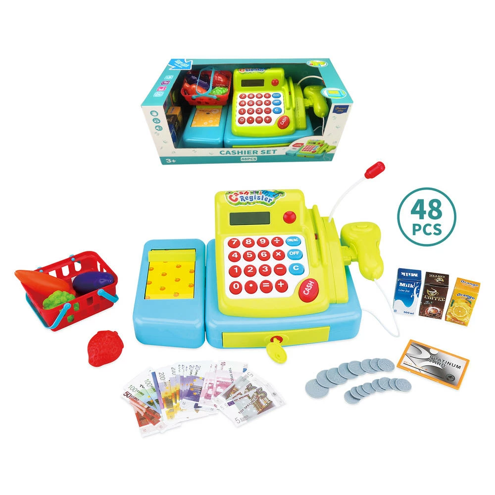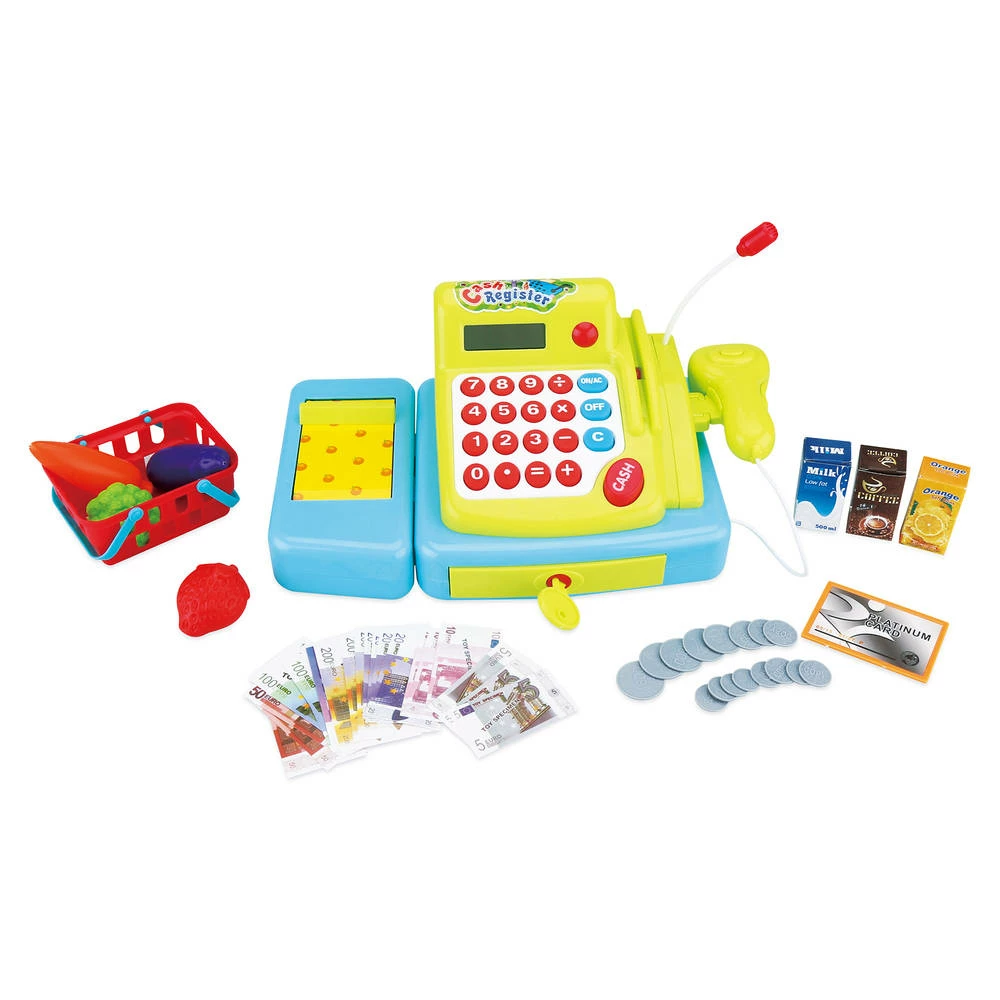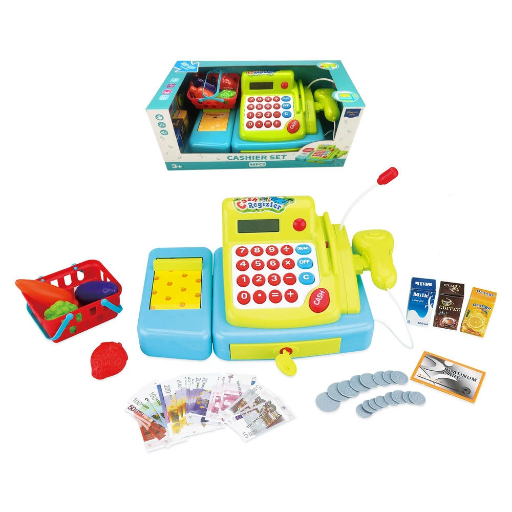Heb je je wel eens afgevraagd hoe het zou zijn om een eigen winkel te hebben? Speel dan met deze kassaset met geluid en lichtjes. De set bestaat uit een kassa, 16 munten, een creditcard, 3 sapflessen, een sleutel, 21 notitieblaadjes, een mand en 4 vruchten. Je bootst dus de volledige supermarktervaring na. Laat een vriend of vriendin selecteren wat hij of zij wil kopen. Hierna bereken je wat het kost. Je scant het verkochte product, waarna de koper kan betalen met papiergeld, munten of een creditcard. Het ‘cash’ knopje komt hierna in beeld. Je neemt vervolgens het geldt en geeft de klant eventueel wisselgeld. De transactie is nu voltooid.
