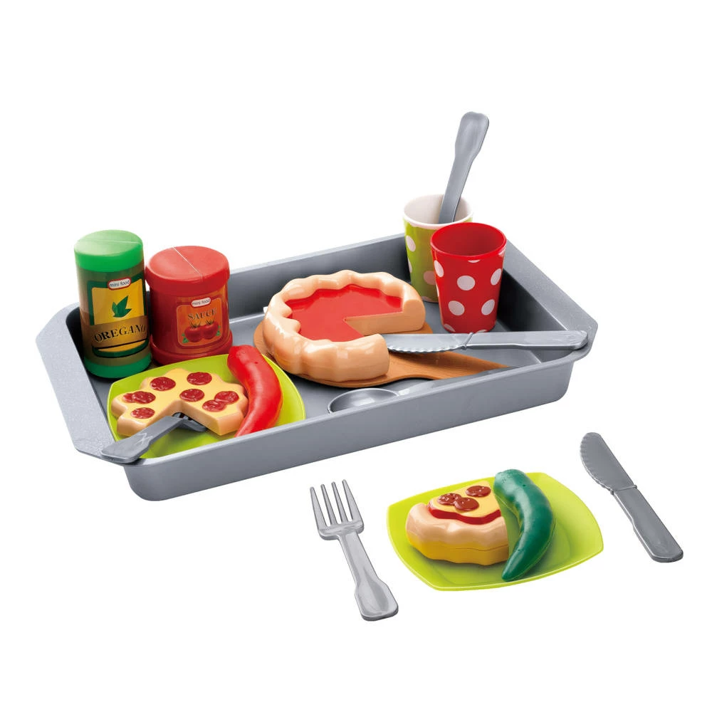 Speel rollenspel met deze uitgebreide speelgoedpizzaset. De speelset bevat diverse accessoires om een speelgoedpizza te maken.