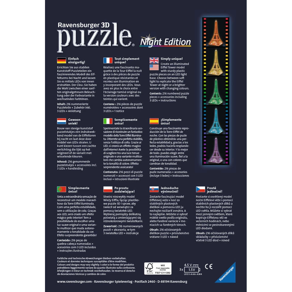 Puzzel jij de Ravensburger 3D-puzzel Eiffeltoren bij nacht in elkaar? Uniek drie dimensionaal puzzelplezier, dat is deze 3D gebouwenpuzzel van Ravensburger. Puzzel een prachtig 3D bouwwerk in elkaar en geef het een mooi plaatsje op bijvoorbeeld je wandplank of het dressoir. De stevige plastic stukjes passen precies in elkaar. Zo bouw je vanuit gebogen, platte en vouwbare stukjes een uniek model van de Eiffeltoren, zonder lijm te gebruiken! De doos bevat 216 puzzelstukjes, bouwonderdelen, een multicolor lamp en een handleiding met afbeeldingen.
