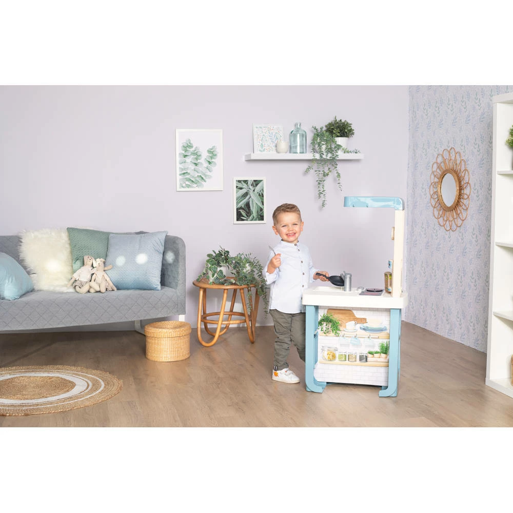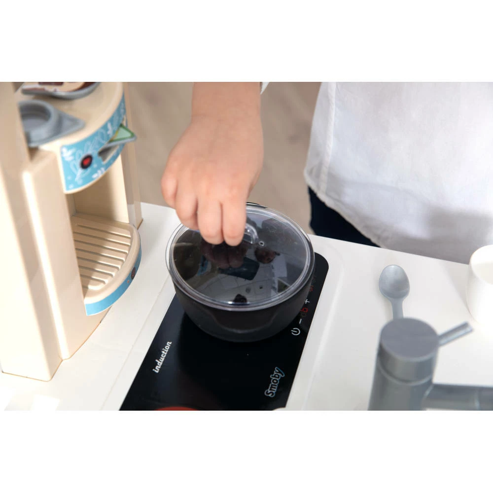 - De keuken bestaat uit 1 kookplaat met geluidseffecten, 1 spoelbak, 1 oven, 1 koelkast, 1 afzuigkap, 1 capsule-espressomachine en verschillende opbergruimtes.